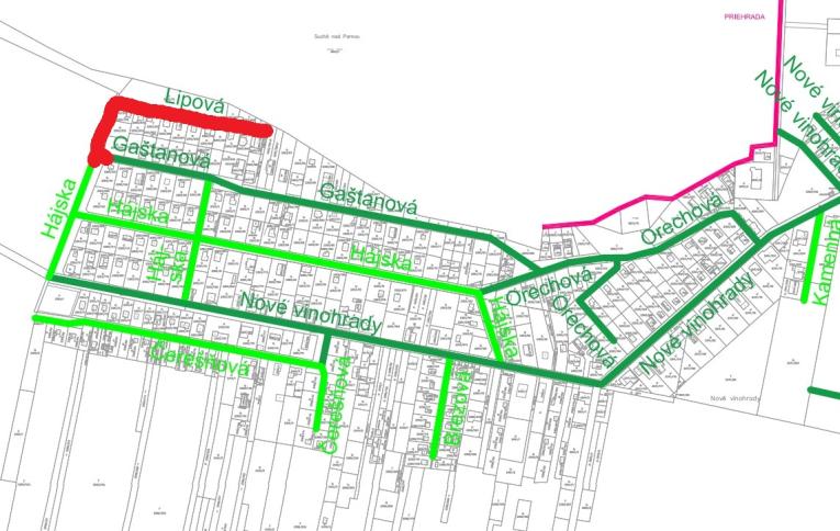 Oznamujeme obyvateľom časti obce Nové Vinohrady, že v dňoch 3.-11.11.2025 bude obmedzená premávka na uliciach Hájska, Gaštanová a Lipová. Bude neprejazdná časť ulice Hájska od križovatky s Gaštanovou ulicou a celá Lipová ulica, viď na priloženom obrázku červenou farbou.