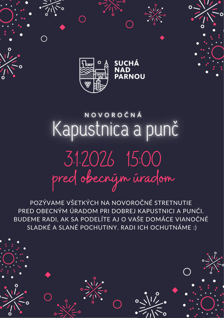 Pozývame všetkých na novoročné stretnutie pri dobrej kapustnici a punči. Uskutoční sa 3.1.2026 (sobota) o 15:00 hod. pred budovou obecného úradu. Budeme radi, ak sa podelíte aj o vaše domáce vianočné sladké a slané pochutiny. Radi ich ochutnáme.