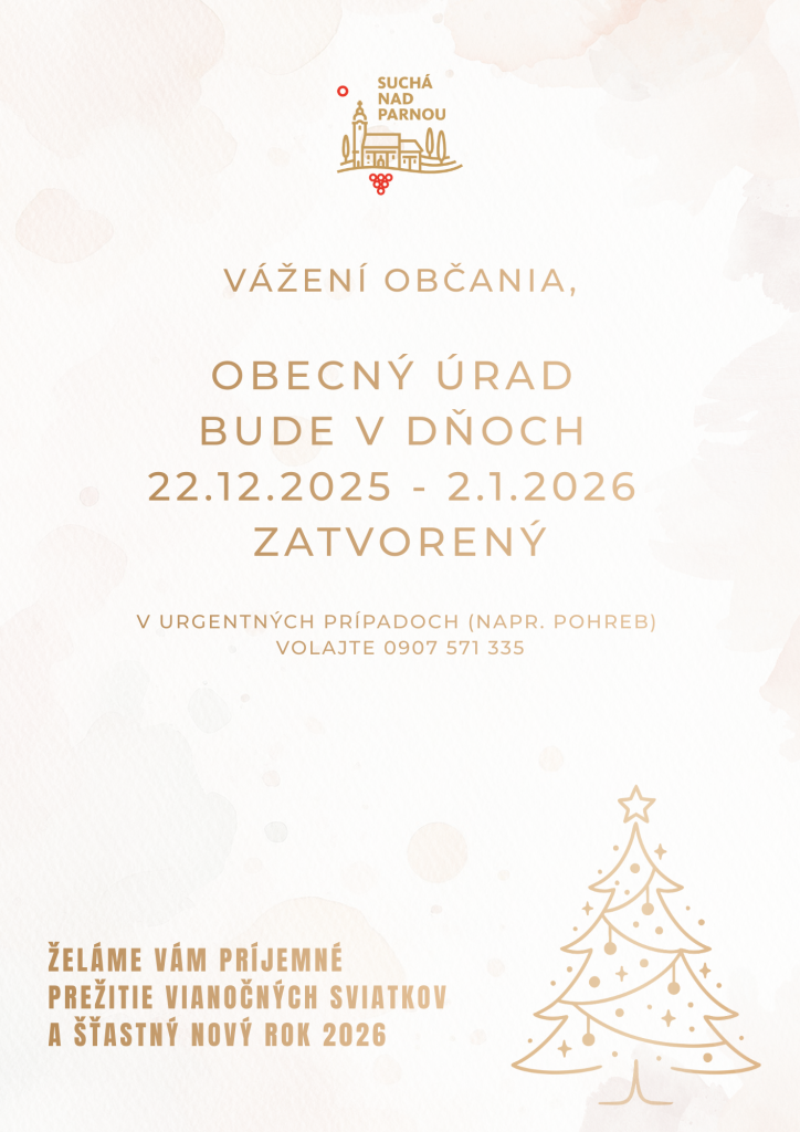 Obecný úrad bude cez vianočné sviatky zatvorený v dňoch 22.12.2025-2.1.2026. V súrnych prípadoch (napr. pohreb) volajte č. 0911 388 252.