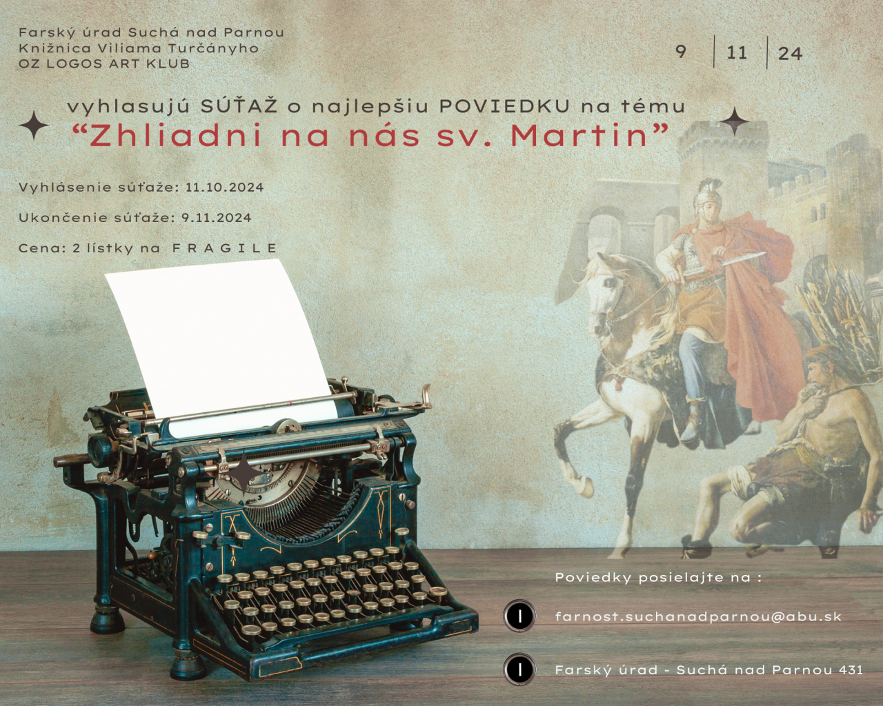 Farský úrad v spolupráci s Knižnicou Viliama Turčányho a OZ LOGOS ART KLUB vyhlasujú súťaž o napísanie poviedky voľne dotýkajúcej sa patróna farnosti sv. Martina.