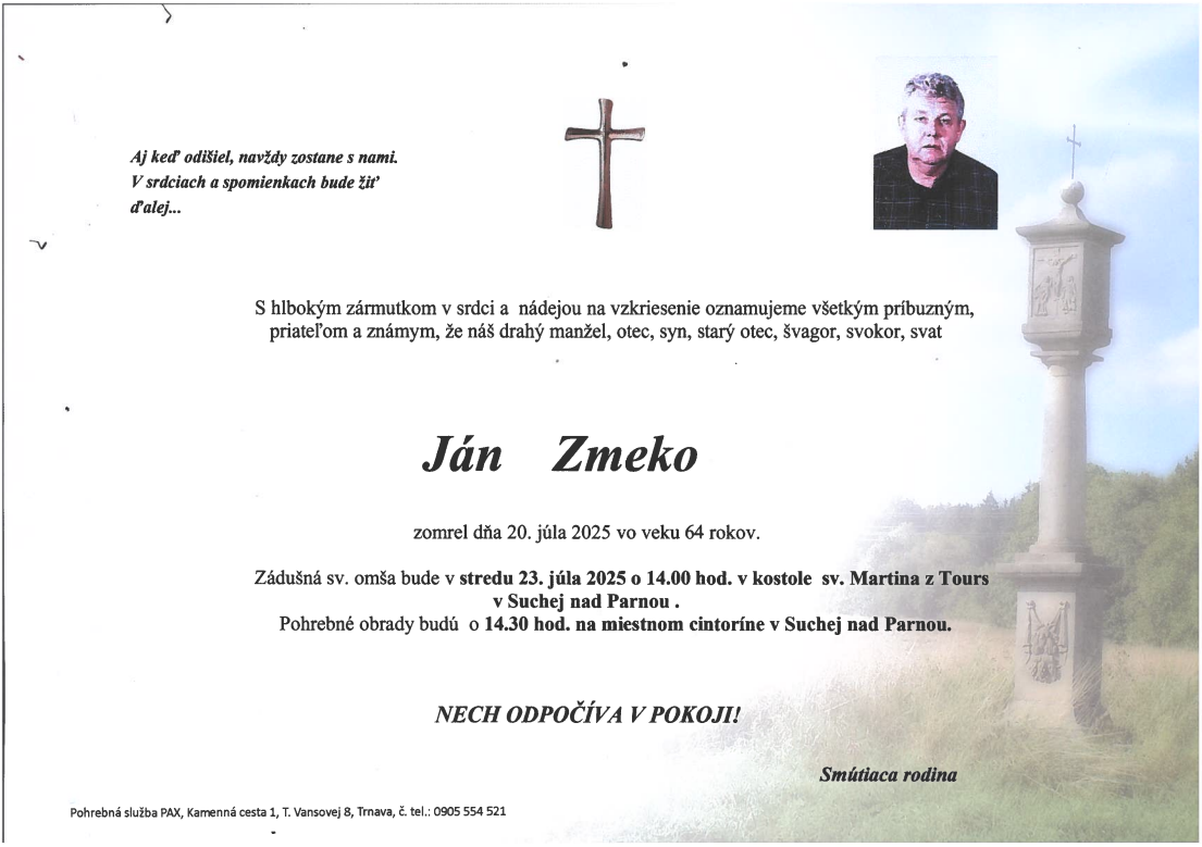 Oznamujeme, že dňa 20.7.2025 vo veku 64 rokov zomrel náš spoluobčan Ján Zmeko. Zádušná svätá omša za zosnulého bude dňa 23.7.2025 o 14:00 hod. vo farskom kostole v Suchej nad Parnou a po nej posledná rozlúčka na miestnom cintoríne.
