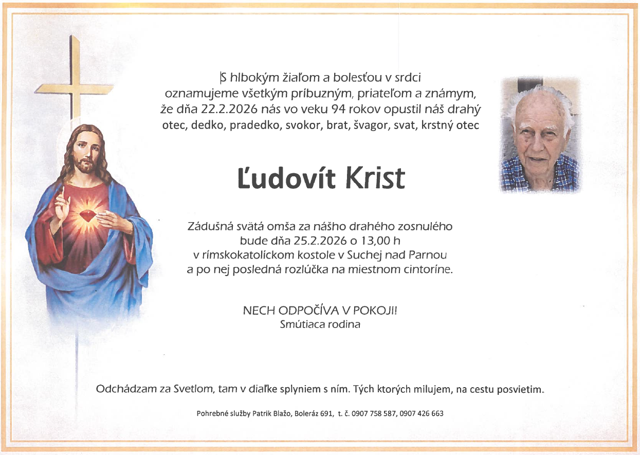 Smútiaca rodina Kristová s hlbokým zármutkom oznamuje, že vo veku 94 rokov zomrel Ľudovít Krist. Zádušná omša so zosnulým bude v stredu 25.2.2026 o 13:00 hod. v kostole v Suchej nad Parnou a po nej bude posledná rozlúčka na miestnom cintoríne.