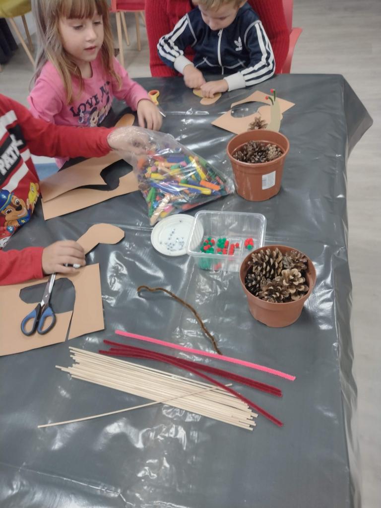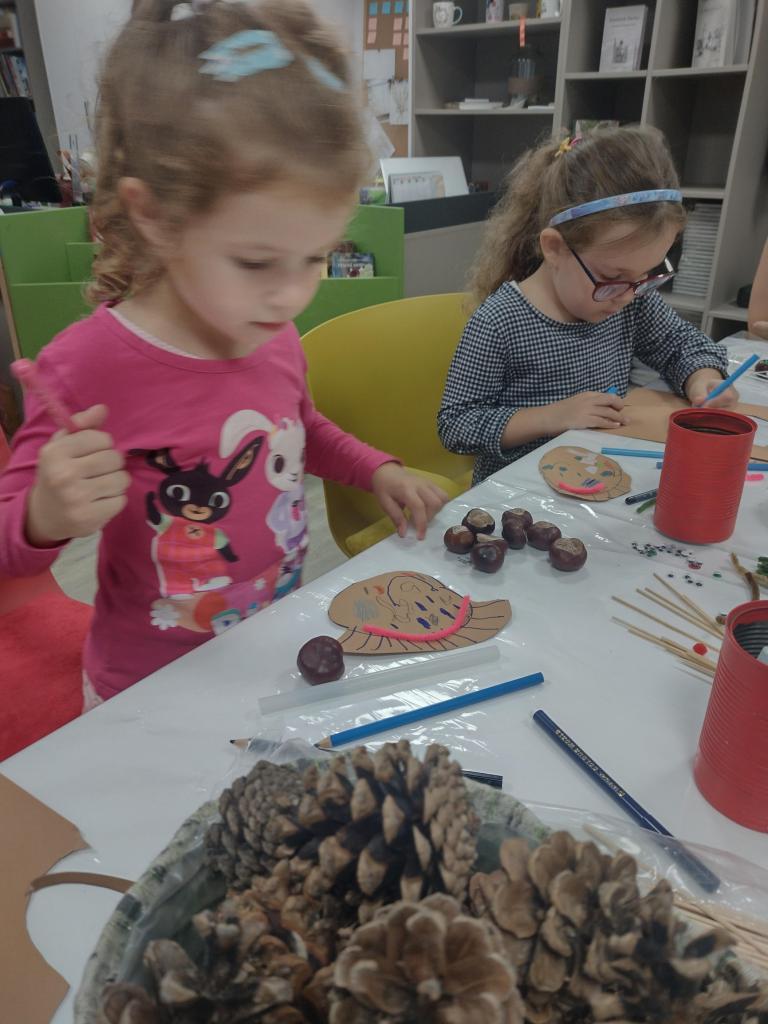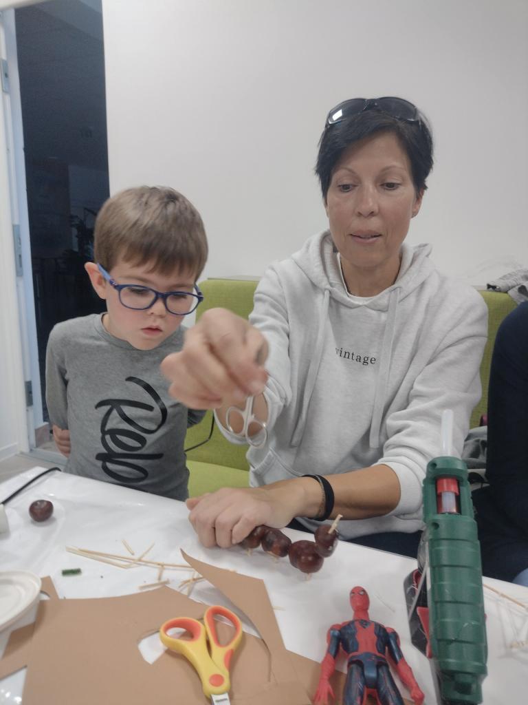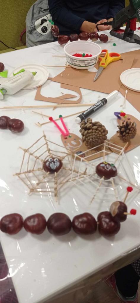 Zišli sme sa v piatkový podvečer, 13.10.2023, v obecnej knižnici a spolu sme si vyrobili „slimáčikov“ a „pavúčikov na sieťke“ z tradičných zásob jesene - gaštanov a šišiek.