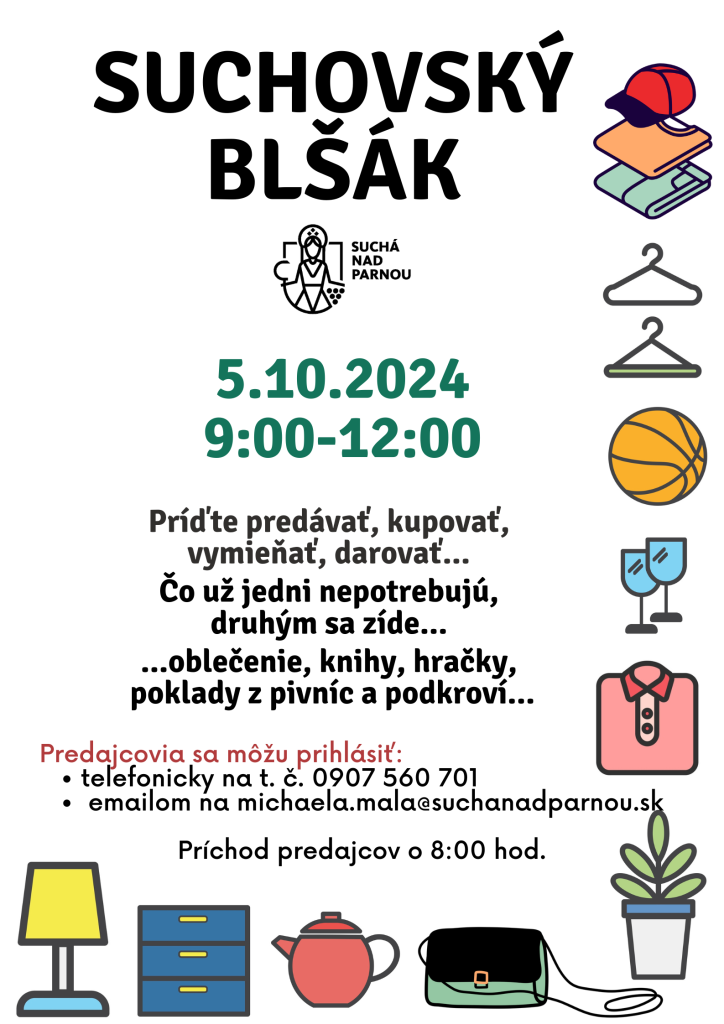 Prvú októbrovú sobotu sa zišlo dvadsať predajcov v kultúrnom dome v Suchej nad Parnou, aby dali veciam druhú šancu. Tradičné kúsky detského oblečenia doplnili dámske odevy, knihy, detské potreby, obrazy, športové potreby, domáce a kuchynské spotrebiče a mnohé iné.
