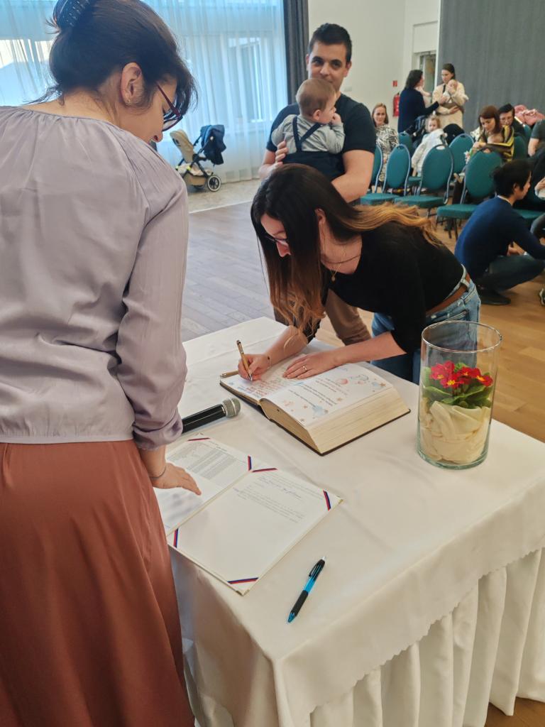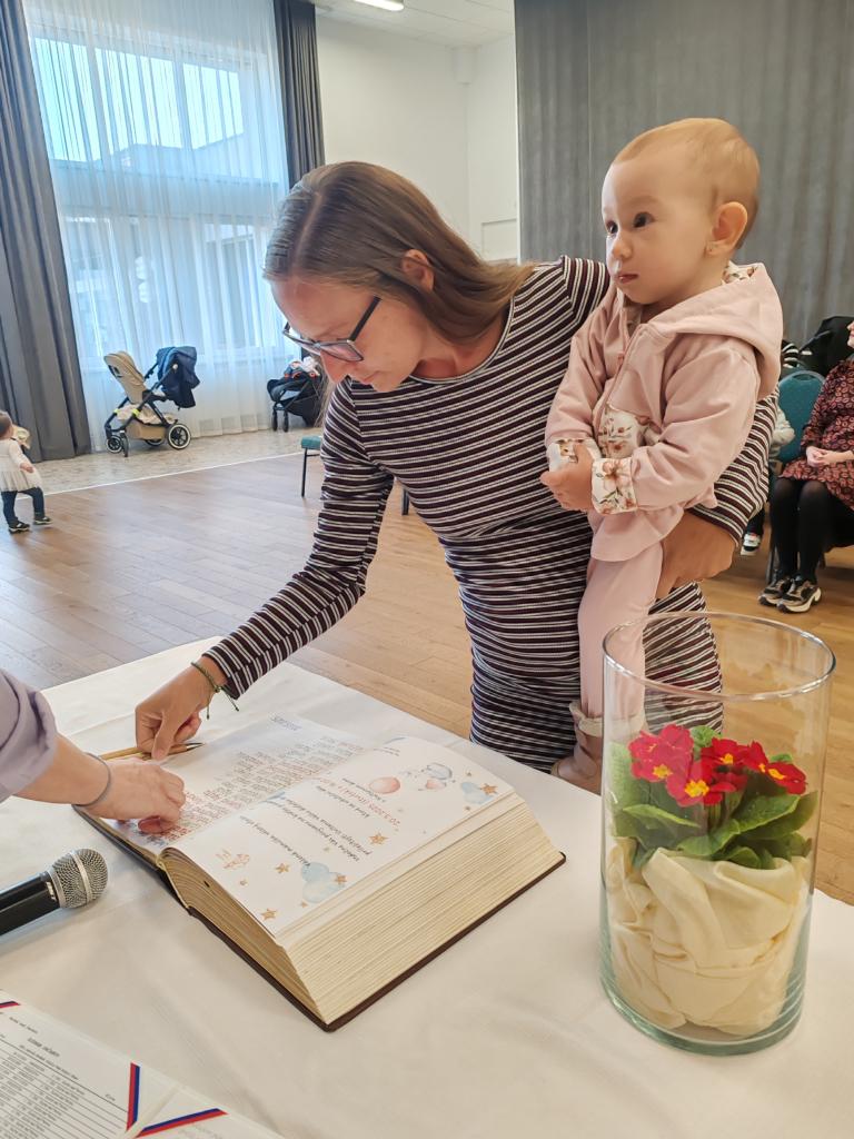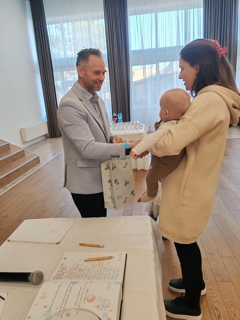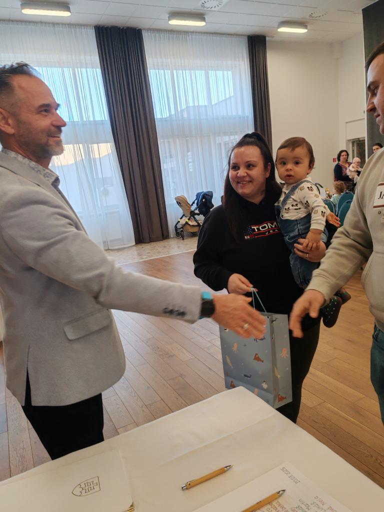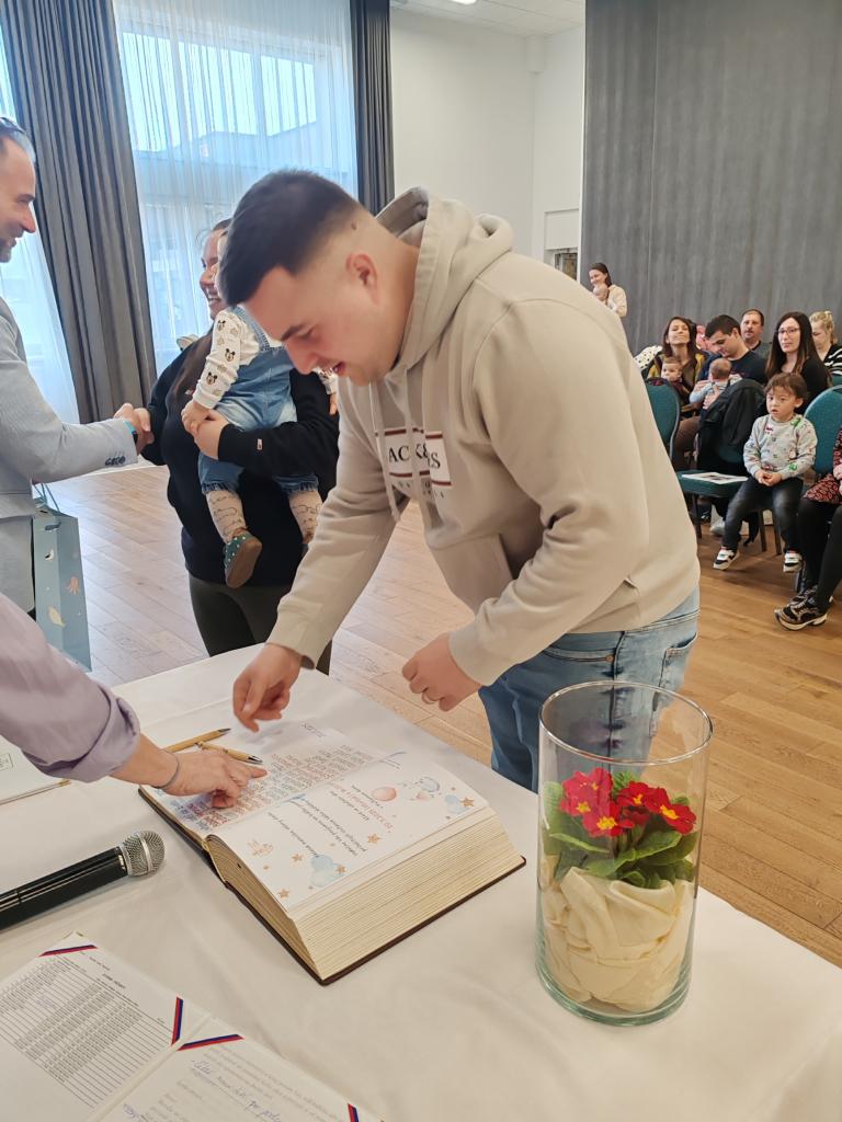 Rodičia sa zapísali do pamätnej knihy obce a prevzali od starostu darček ako spomienku na tento slávnostný deň.