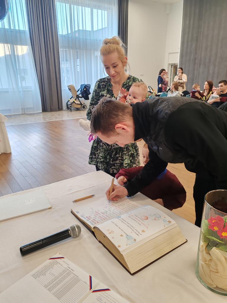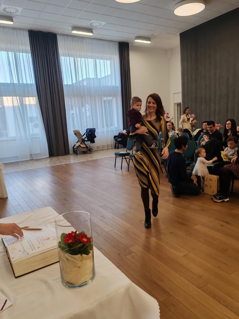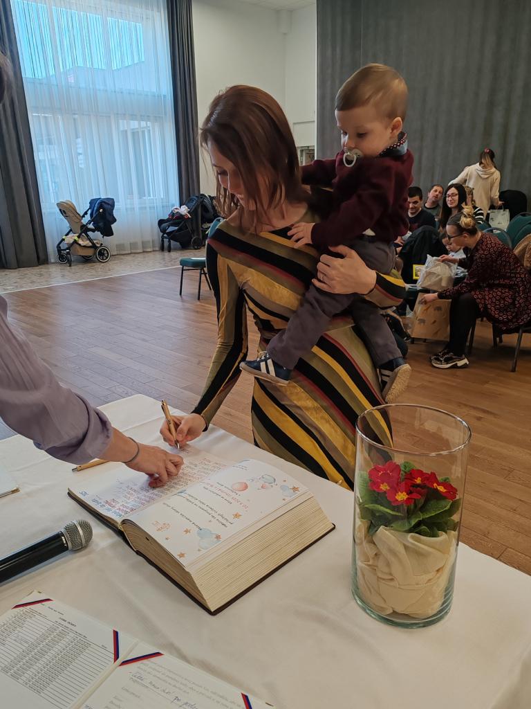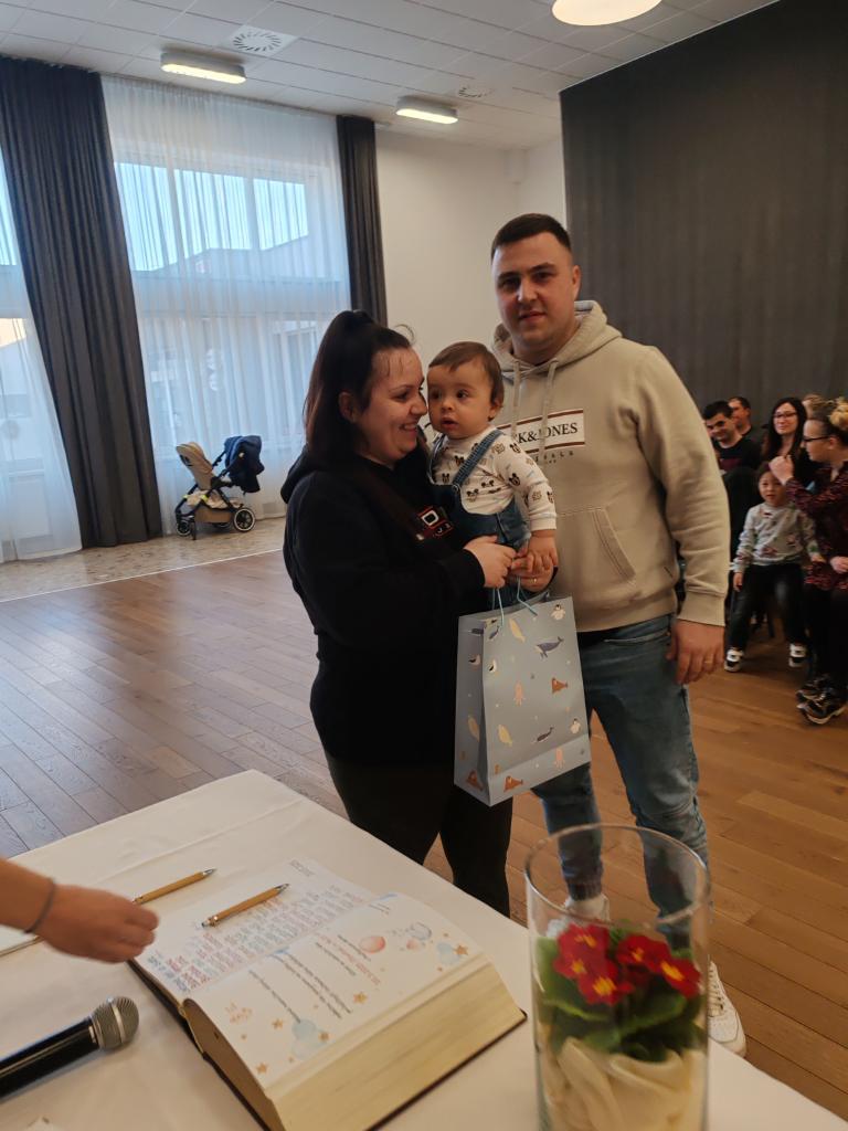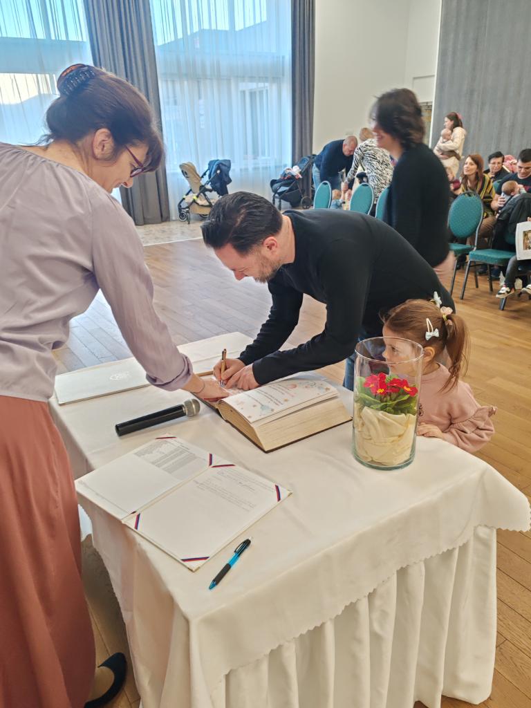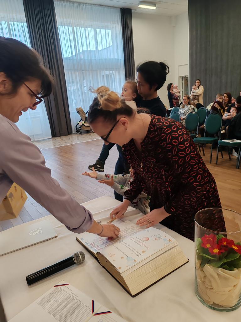 Rodičia sa zapísali do pamätnej knihy obce a prevzali od starostu darček ako spomienku na tento slávnostný deň.