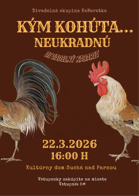 Pozývame vás v nedeľu 18.3.2026 o 16:00 hod. do kultúrneho domu v Suchej nad Parnou na kabaretné predstavenie Kým kohúta...neukradnú.